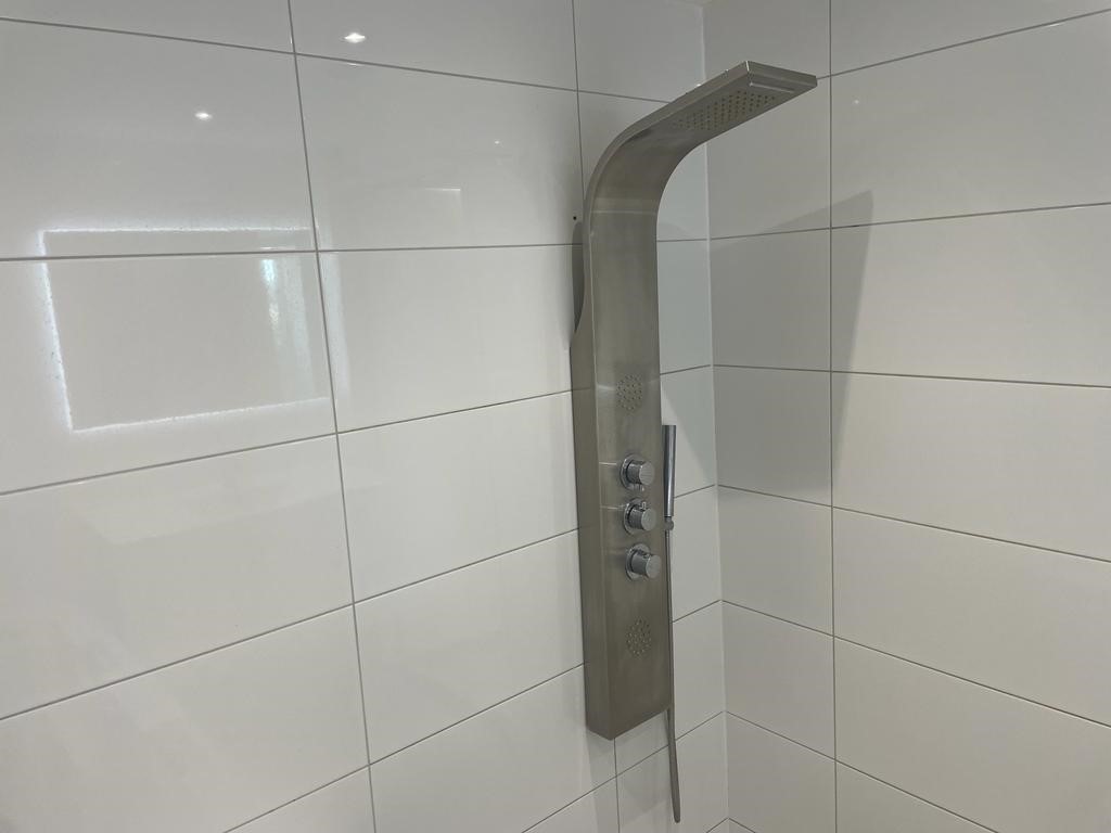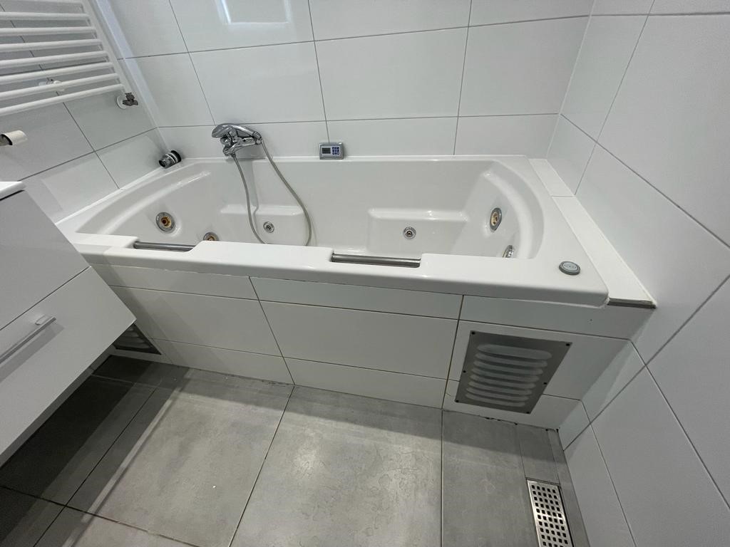 De badkamer heeft een duo-bubbel-ligbad, inloopdouche en een wastafelmeubel.